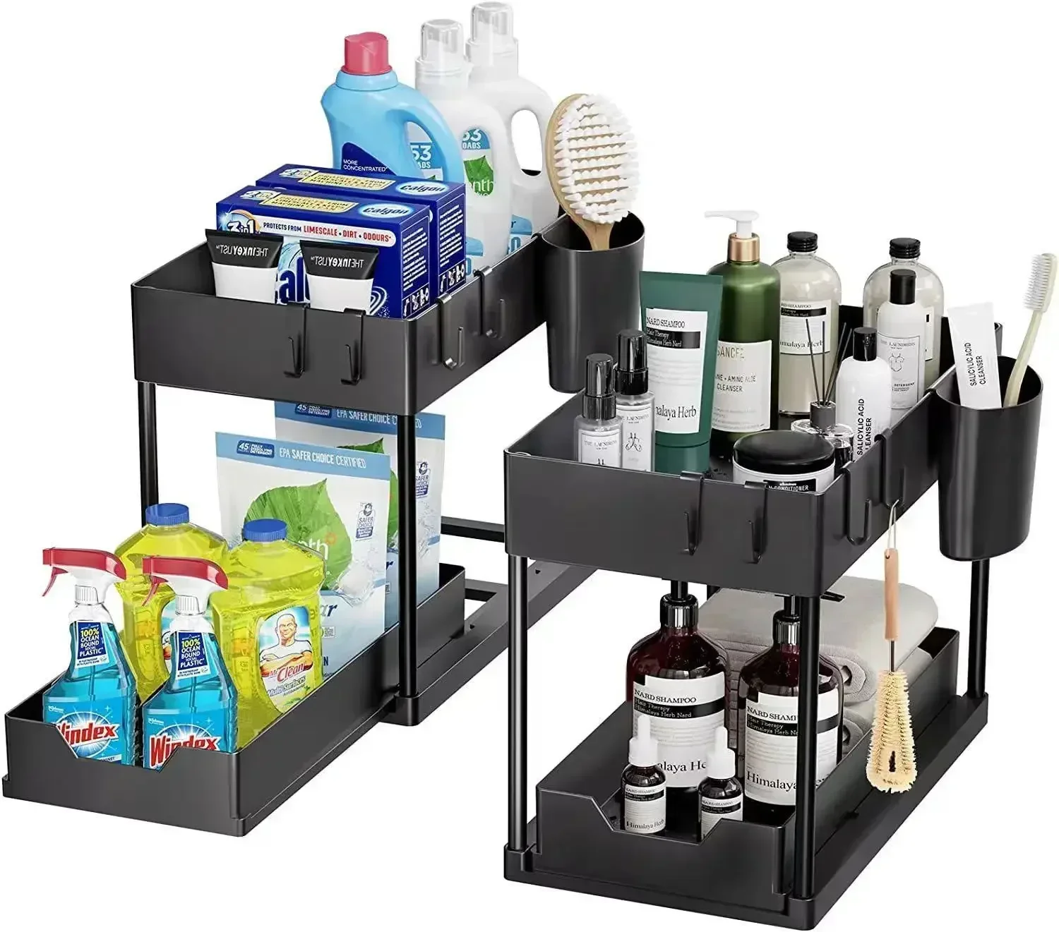 Organizador de 2 camadas sob a pia, armário deslizante, cesta, rack de armazenamento com ganchos, copo pendurado, organizador de cozinha de banheiro
